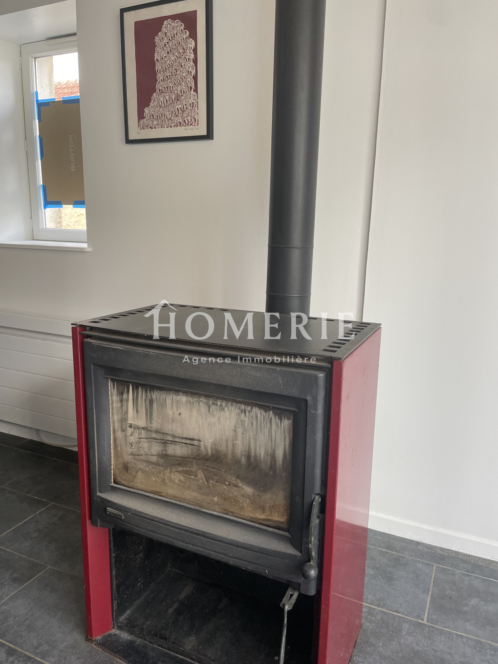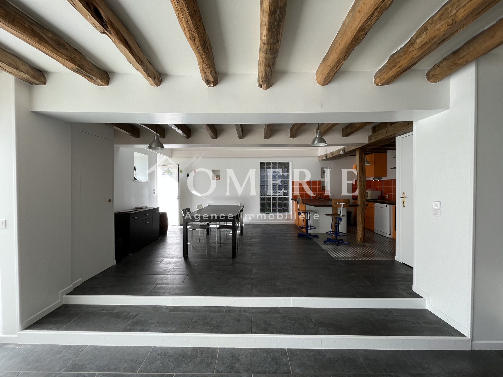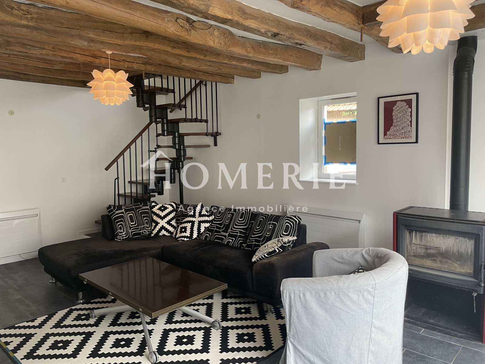 Dans le prolongement, spacieux salon avec pôele à bois (poutres au plafond, grande baie vitrée).
