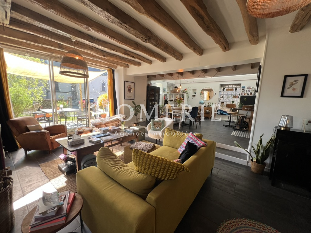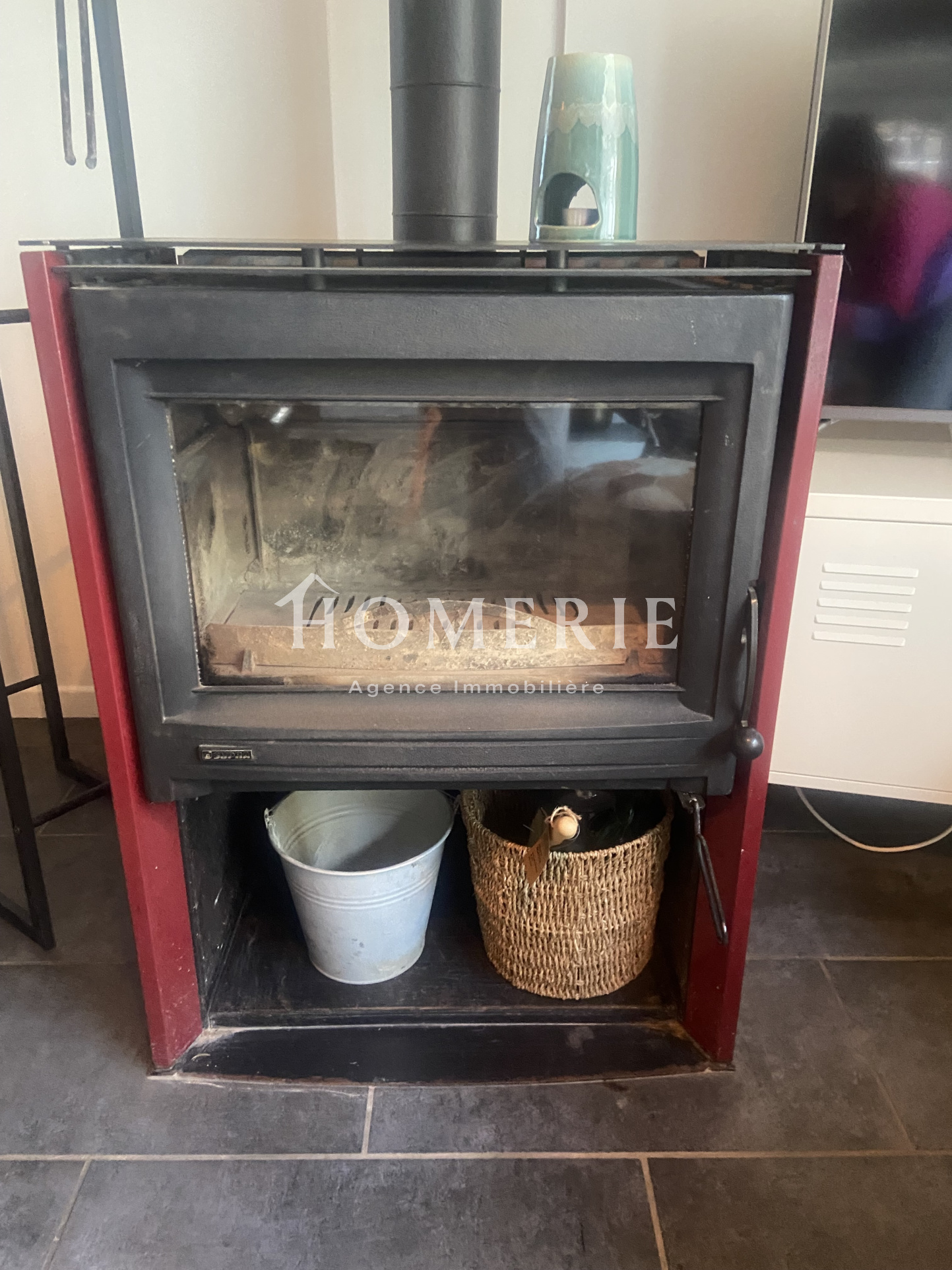 Dans le prolongement, spacieux salon avec pôele à bois, poutres apparentes et grande baie vitrée.