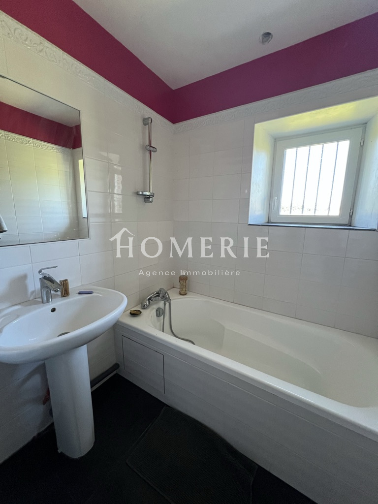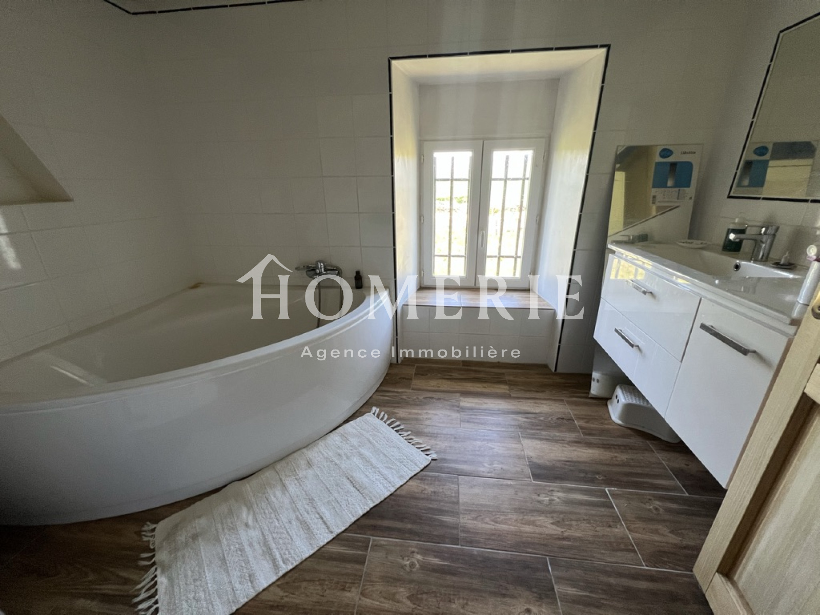 La bâtisse principale d'une superficie habitable de 162,46m2 entièrement rénovée, se compose d'une vaste entrée desservant une lumineuse pièce de vie avec sa cuisine aménagée ouverte sur l'espace salle à manger et le salon avec poêle à bois. Le rez-de-chaussée offre également une chambre de plain-pied avec sa salle de bains privative. Un wc indépendant. Chauffage avec radiateurs électriques récents et toiture en bon état.