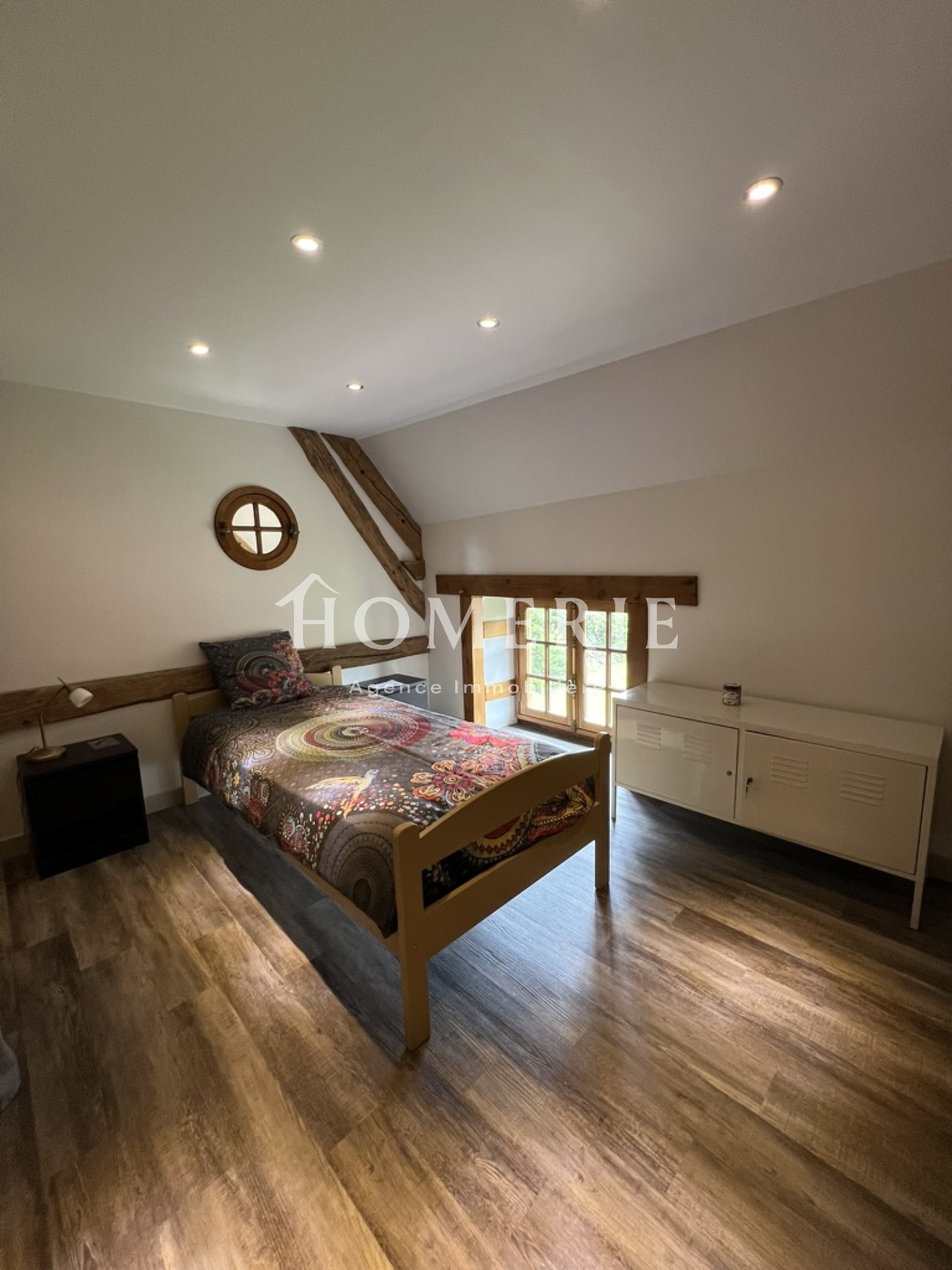 A l'étage un grand bureau - palier dessert une première chambre avec mezzanine et salle d'eau privative. Une seconde chambre avec mezzanine et un dressing. Une troisième chambre avec mezzanine, couloir, wc et une salle de bains. Le second palier dessert une spacieuse chambre parentale avec poutres apparentes.
