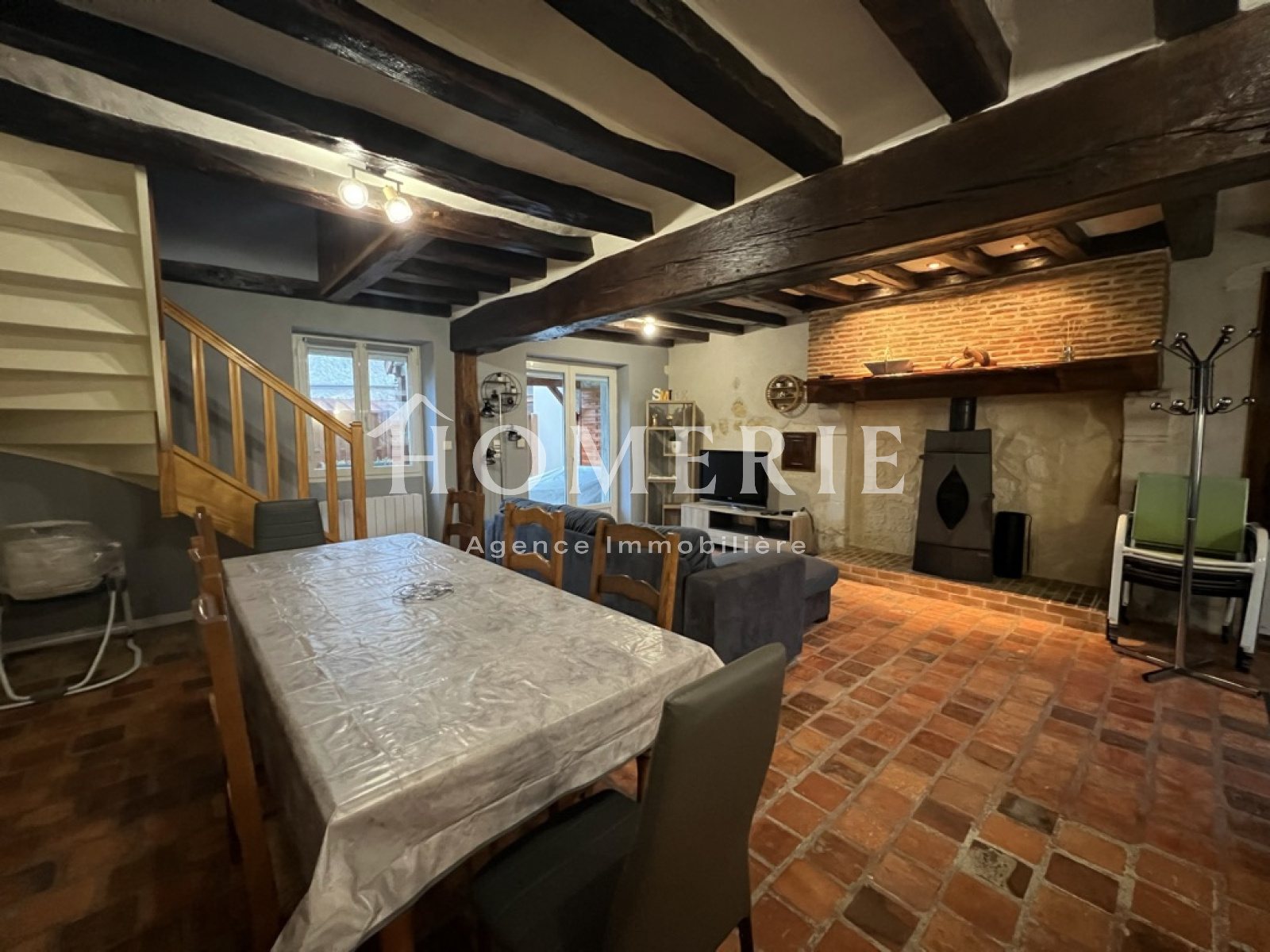 Au rez-de-chaussée, un spacieux salon-salle à manger d'environ 37m2 avec poêle à bois donnant accès à la terrasse couverte en partie située sur l'arrière du bien, une cuisine aménagée et équipée donnant sur la terrasse avant, une buanderie et salle d'eau avec wc, une chambre avec mezzanine au-dessus. Chauffage radiateurs électriques à inertie.