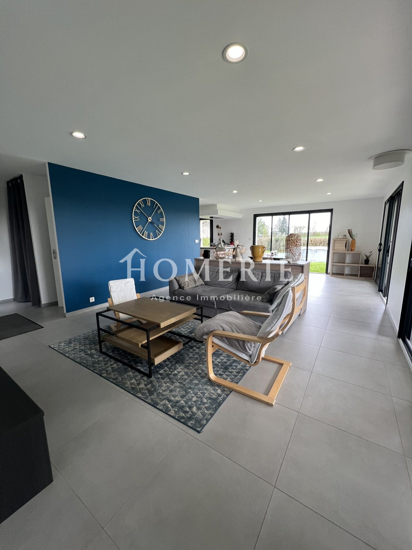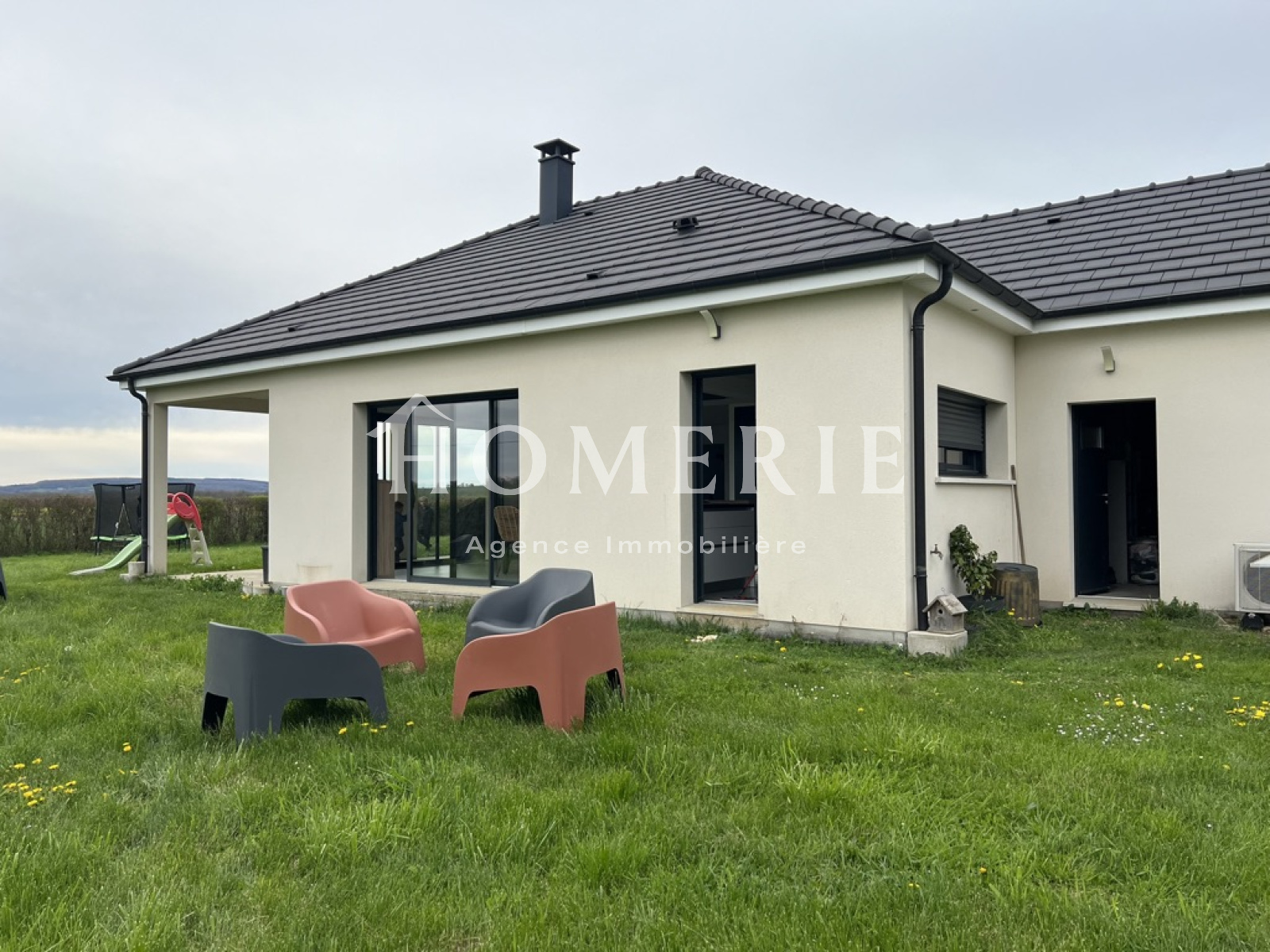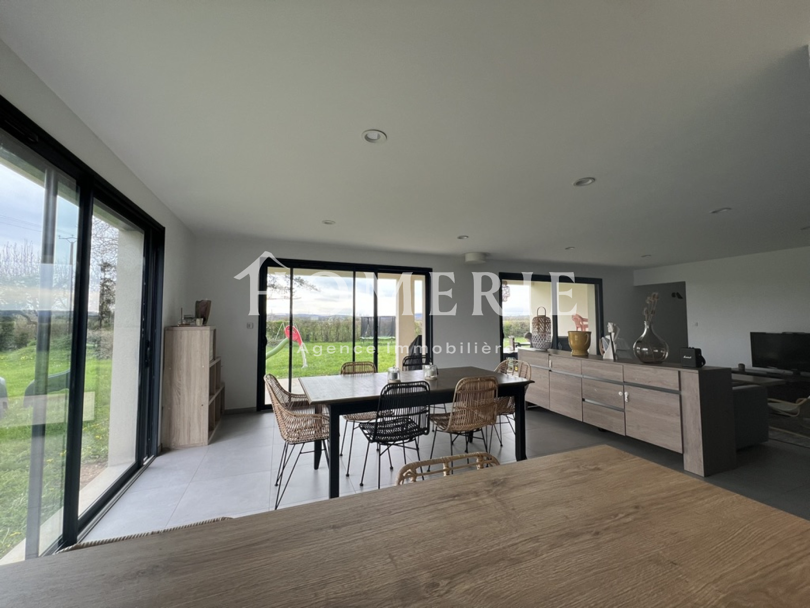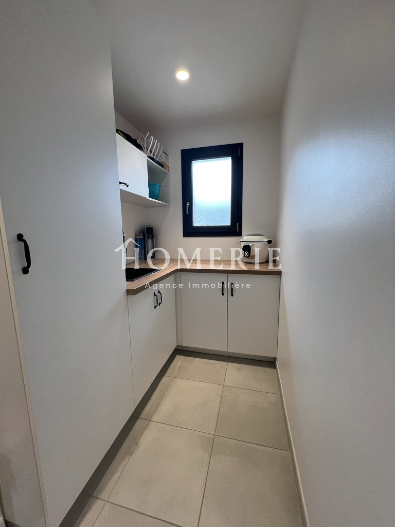 Cette construction achevée en 2019 dispose d'une entrée avec placard de rangements, d'un lumineux salon-salle à manger avec de grandes baies vitrées donnant accès à la terrasse extérieure couverte, d'une cuisine aménagée entièrement équipée avec son îlot central, d'une arrière cuisine avec espace buanderie et wc.