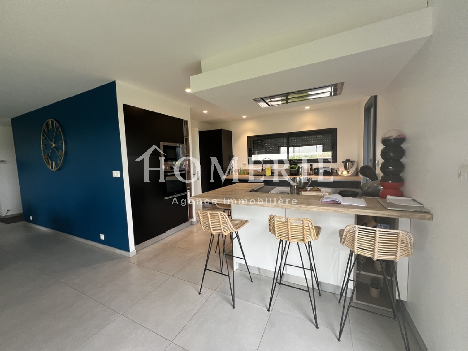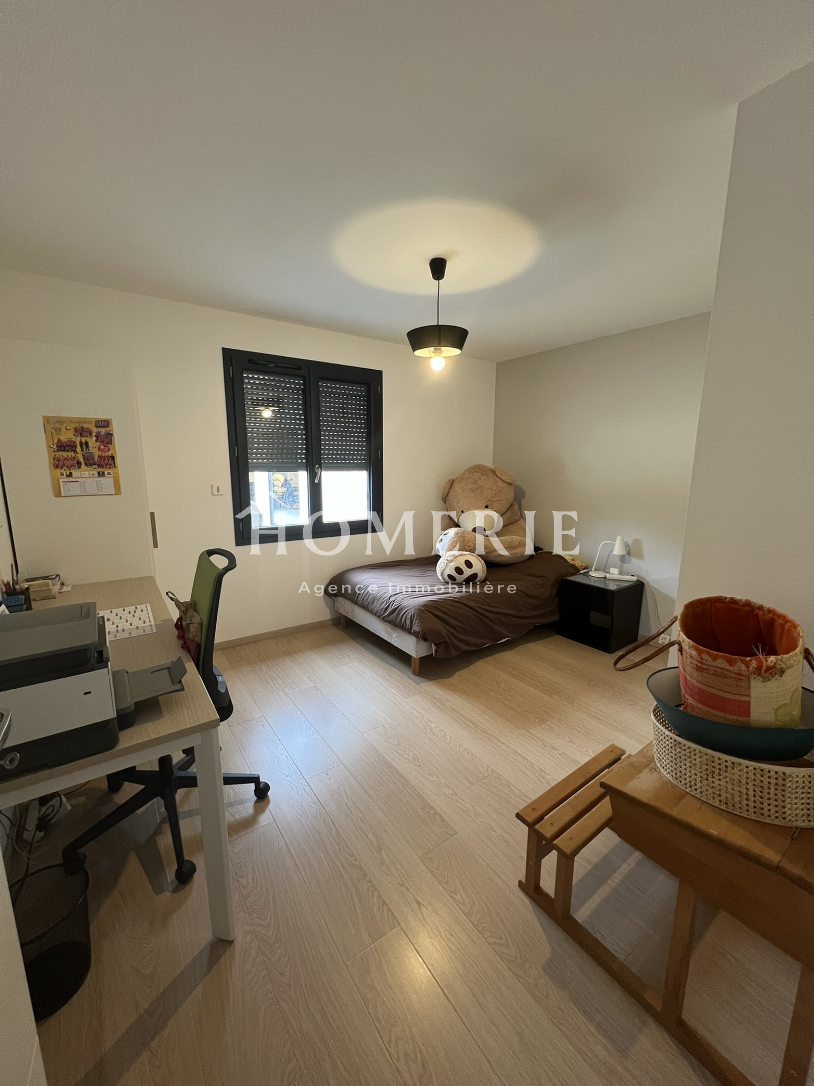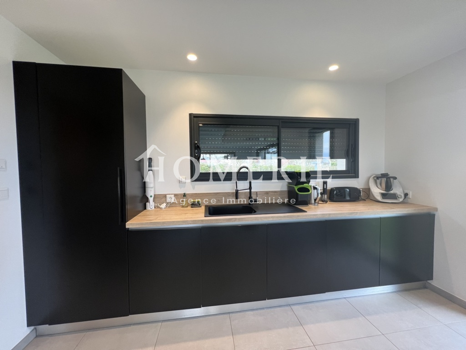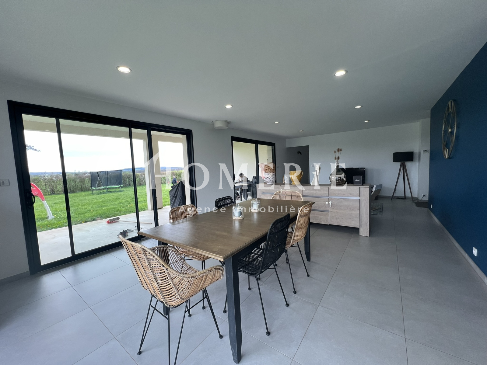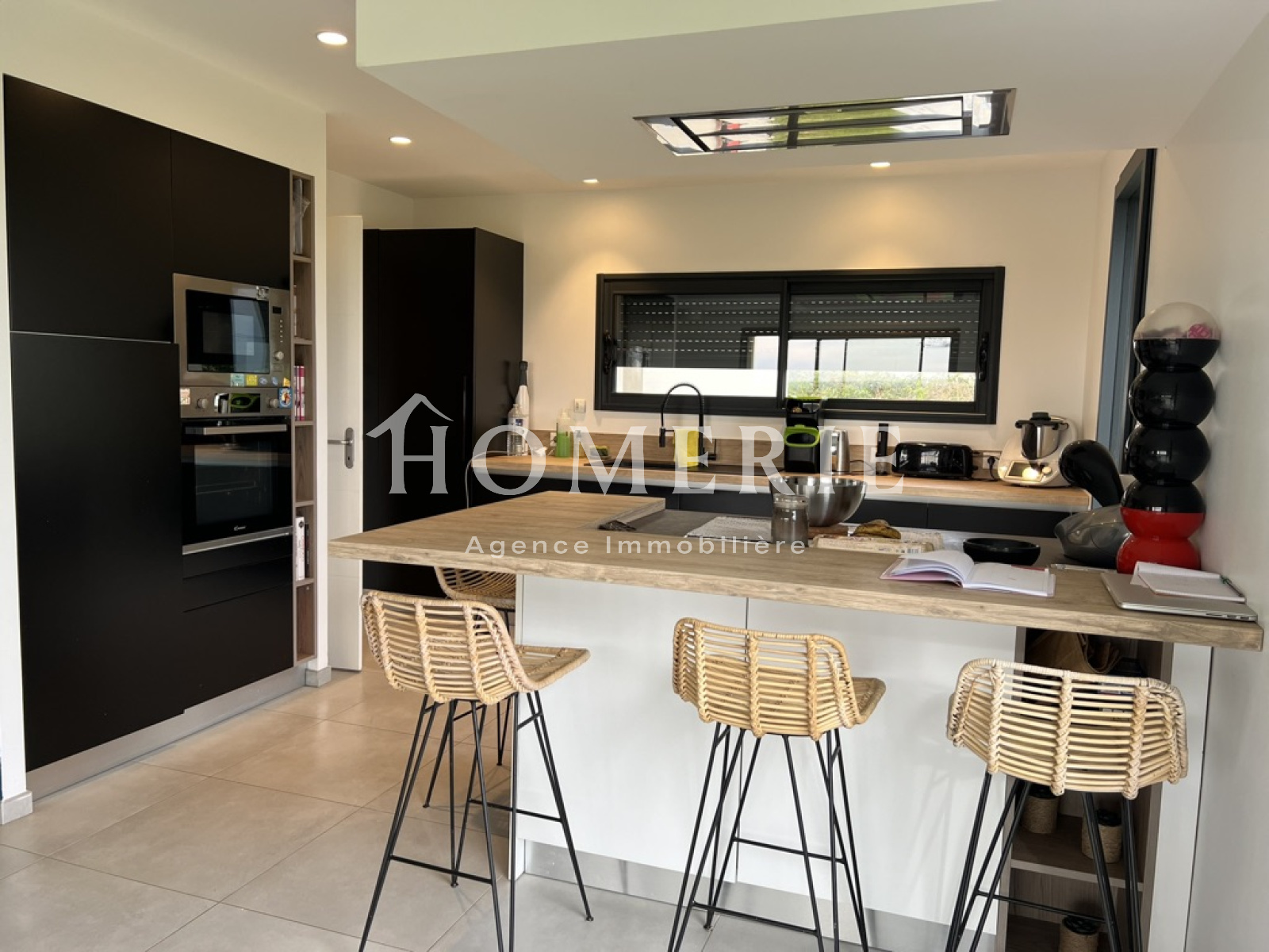 Cette construction achevée en 2019 dispose d'une entrée avec placard de rangements, d'un lumineux salon-salle à manger avec de grandes baies vitrées donnant accès à la terrasse extérieure couverte, d'une cuisine aménagée entièrement équipée avec son îlot central, d'une arrière cuisine avec espace buanderie et wc.